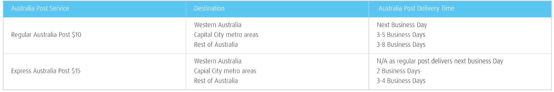 Products are despatched from our warehouse on Monday, Wednesday and Friday each week. Orders must be received by 12noon (WST) or prior on the day of despatch to be included. Orders received after 12noon (WST) will be sent on the next possible despatch day.